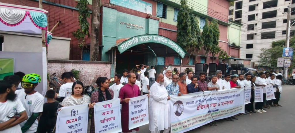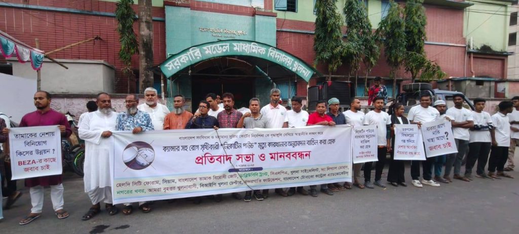 A protest rally and human chain were held in Khulna against the approval of a “nicotine pouch” factory by the Bangladesh Economic Zones Authority (BEZA), alleging that the approval violates public health regulations and disregards the Constitution of Bangladesh as well as the directives of the Honorable Supreme Court. The program was organized under the initiative of the Healthy City Forum, carrying the slogan: “Disease-Causing Nicotine Pouch — Cancel the Approval of This Death Factory.”